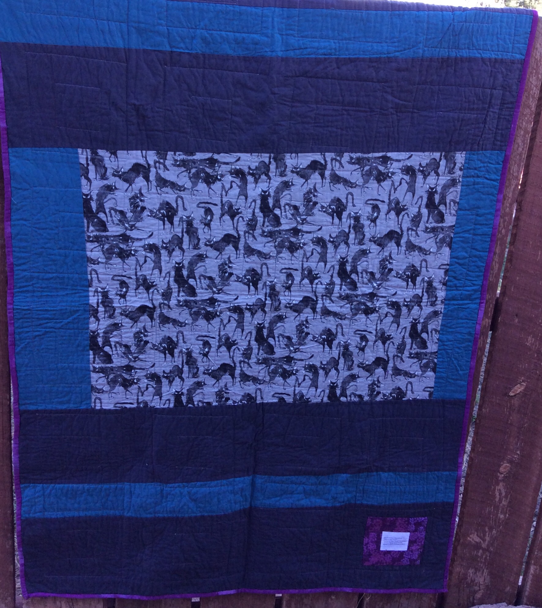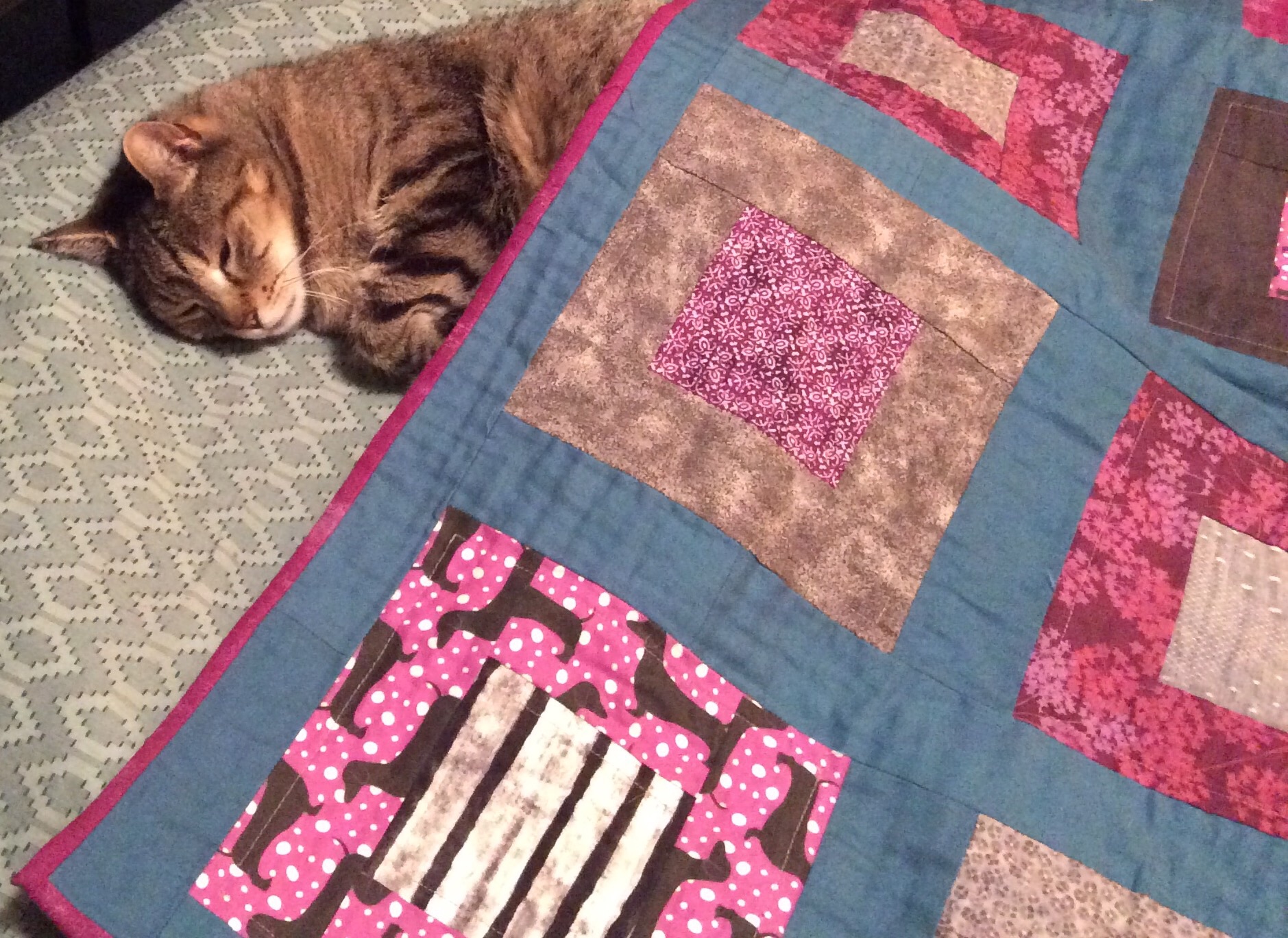 I was much happier with my binding on this quilt than on the binding on my first quilt, Modern Cowgirl Friend. I machine sewed the binding to the quilt front and hand sewed the binding down to the back of the quilt. Here’s the requisite cat/quilt pic with my cat, Jackson, looking very cozy. And no, this wasn’t posed. He would not move when I placed the quilt over him!