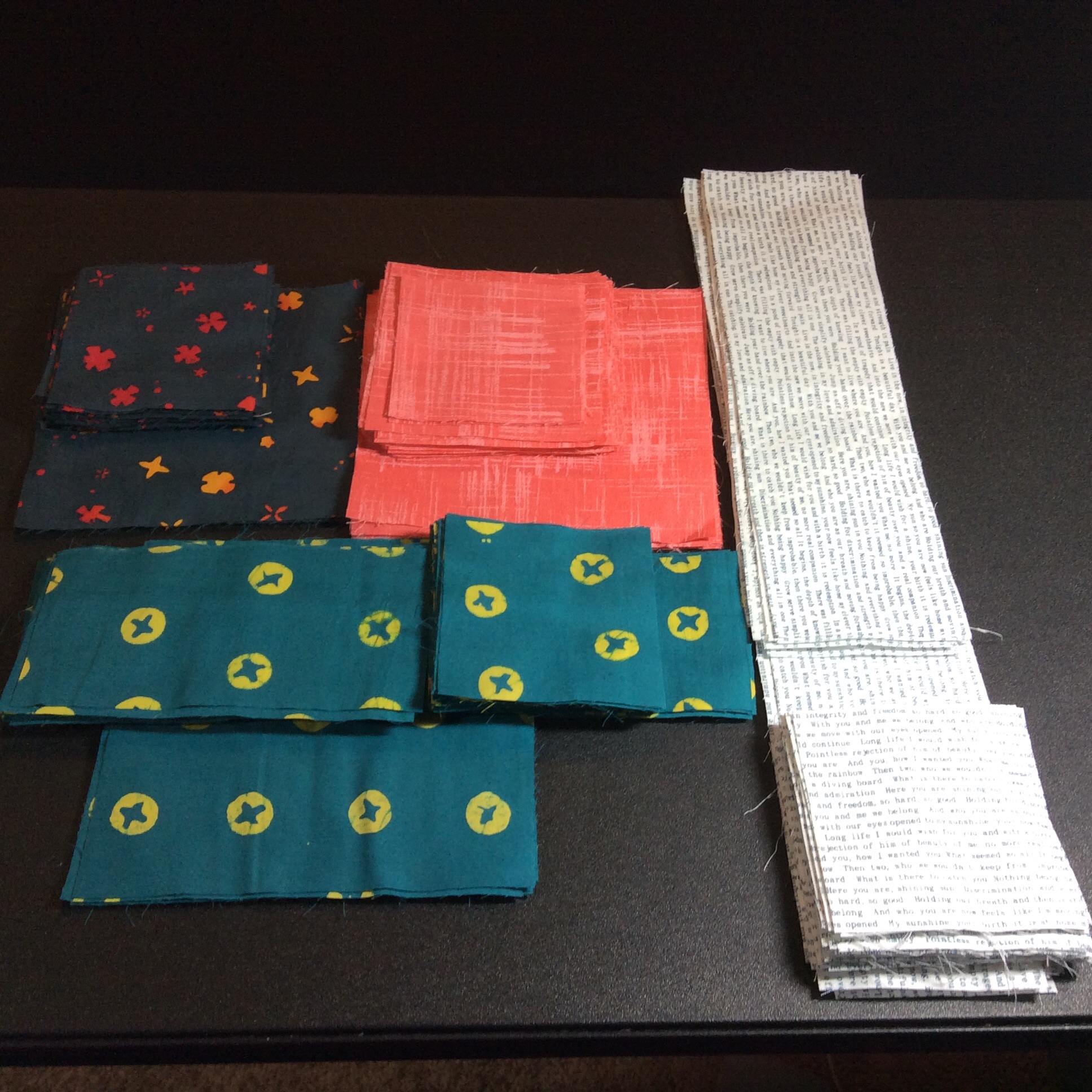 I finished cutting my fabric for the Midnight Mystery Quilt-a-long this morning. I really wanted to get it done last evening. I was working on Fabric D which was my last fabric. I got all the long strips cut, then subcut the 4″ squares, but when I went to subcut my 3 1/2″ by 19″ pieces, I could tell I was running on fumes and would probably make some mistakes. Fatigue and rotary cutters don’t really go well together! I have a thing about meeting deadlines on time, but we’re not even getting our first set of sewing instructions until August 6th. I’m glad my adult brain prevailed over my I-just-want-it-done brain!