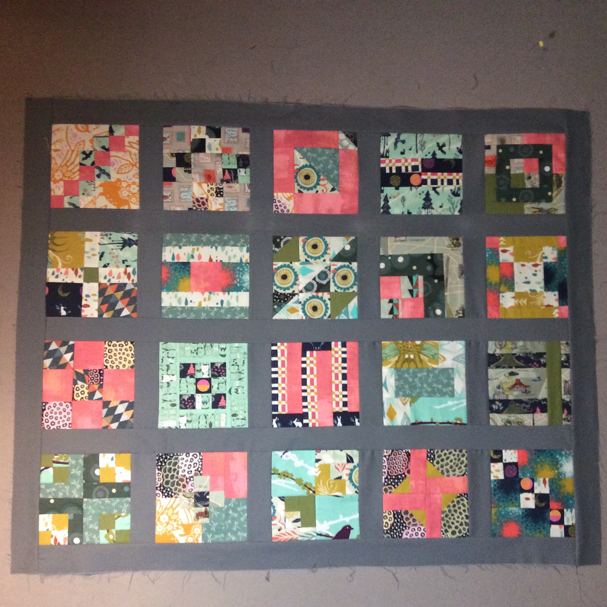 I participated in my first Instagram swap this past Spring/Summer. I swapped #logcabinparty blocks with 16 other quilters (and one lady made me two lovely blocks). Unfortunately, I never received one of the blocks that was promised me, but 17 out of 18 is a dang high percentage. I made two of my own blocks and now will need to make one more to have 20 squares to sew together for a baby-size quilt. Now here’s the exciting part. After I take Christina Cameli’s Free Motion Quilting Workshop at QuiltCon, I plan to free motion quilt the squared-off stipple I like so much on this quilt.
