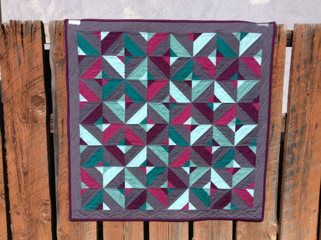 I have completed the first finish of my 2019 Qtr 1 Finish-A-Long Goals thanks to my friend, Roseanne, at Home Sewn By Us whom I got to know after she started commenting on my blog posts over a year ago. I’ve shared with her that I’m much more comfortable with the piecing and design aspect of quilting than the actual quilting, and one thing led to another, and on 12/31/18 I sent my Random Intention Quilt Top that I designed and made in September 2017 as part of a fat quarter contest to Roseanne to quilt it for me. And am I ever glad I did! I had a basic orange peel quilting motif in mind, and Roseanne took my idea and ran with it. And then she came up with a perfect idea for quilting the borders which I had not even thought about. Roseanne shared about quilting Random Intention in her Quilting on A Friend Going Home post. I received the quilt on Friday (Jan 25th), spent part of my weekend binding it, and was actually able to take some outside shots of it because it was a sunny day, and the New Mexico winds were hardly blowing. Below is a pic of the front of the finished 36” x 36” baby quilt.