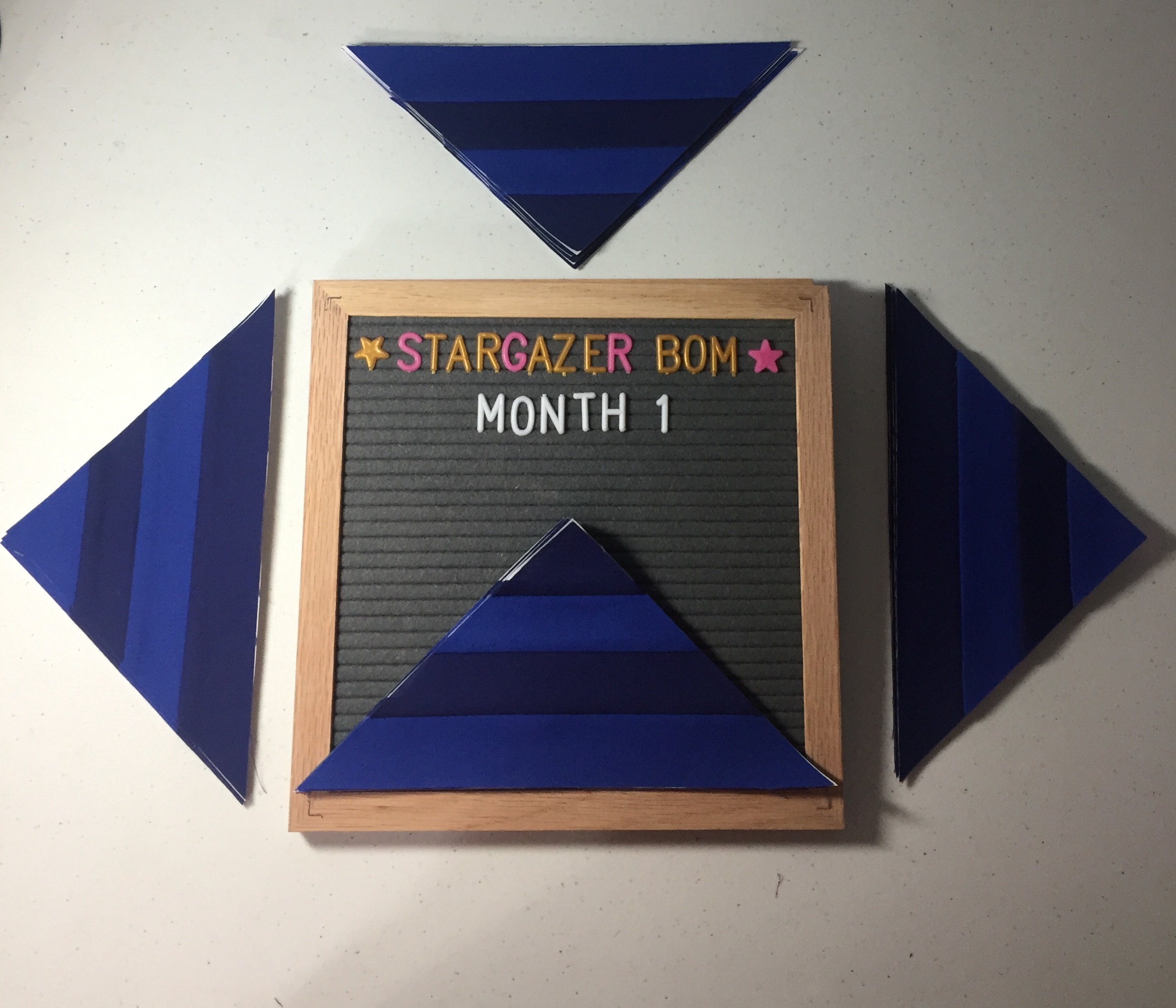My May ‘19 One Monthly Goal is to make the Month 2, Month 3, and Month 4 blocks for the Stargazer Block of the Month (BOM) that was created and is being hosted by Rebecca of Bryan House Quilts. Be sure to click on the Stargazer Block of the Month link above to see Rebecca’s awesome mock-up of the Stargazer quilt. Making this quilt is one of my 2019 goals, but until a couple weeks ago, all I had done was purchase some of the Kona solids needed for this project. I finally completed the Month 1 units this week. Below is a pic of those units on/around my new felt letter board (isn’t it cute!?!).