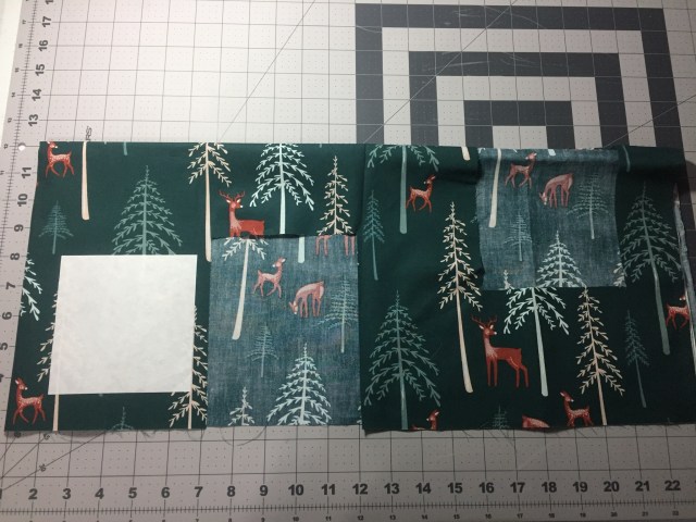 I needed to fussy cut most of the above squares which I both love (for the opportunity to feature specific items) and dislike (because of how much fabric I end up wasting). I do have a fussy cutting tip to share that I learned from the amazing Elizabeth Hartman at Glamp Stitchalot 2016. For my 5” squares, I cut 4.5” squares of freezer paper and centered the square over the image I wanted to cut and then pressed the freezer paper square shiny side down. Then I placed my ruler on the square and added a 1/4” seam allowance around each side to get a 5” fussy cut square. See my deer fabric below after cutting two squares and getting ready to cut one more. I’ve been watching a lot of old Great British Baking Show episodes on Netflix, and the bakers often talk about feeling “gutted.” That’s what I feel I do to my fabric when I fussy cut!