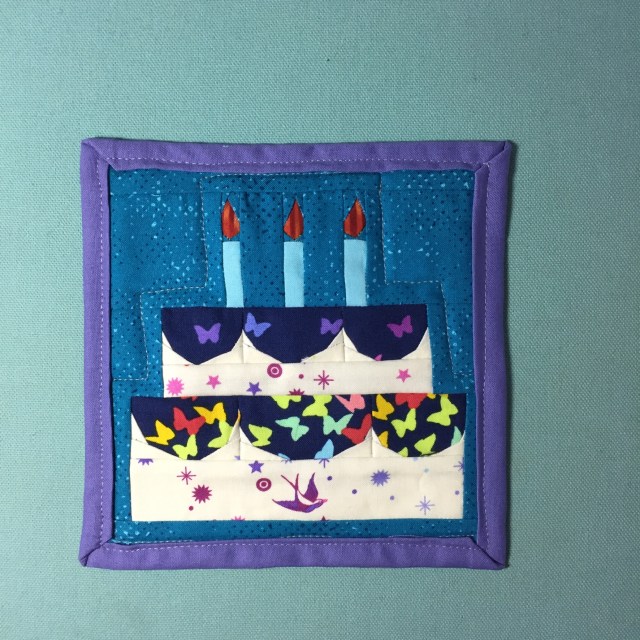 I’m overall happy with the Birthday Cake fabric card for my Aunt Lois, and I got it in the mail to her on Saturday, so she will get it by her 90th birthday on May 10th. I used a cheater binding where the backing fabric is brought over to the front, and a part of me wishes I’d gone to the trouble to actually bind this fabric card using the Binding Mini Mini Quilts Tutorial by Yvonne@Quilting Jetgirl. Oh well, maybe next time. And it’s helpful to remember the wise saying: Done is Better Than Perfect! And I think Aunt Lois will like it.
