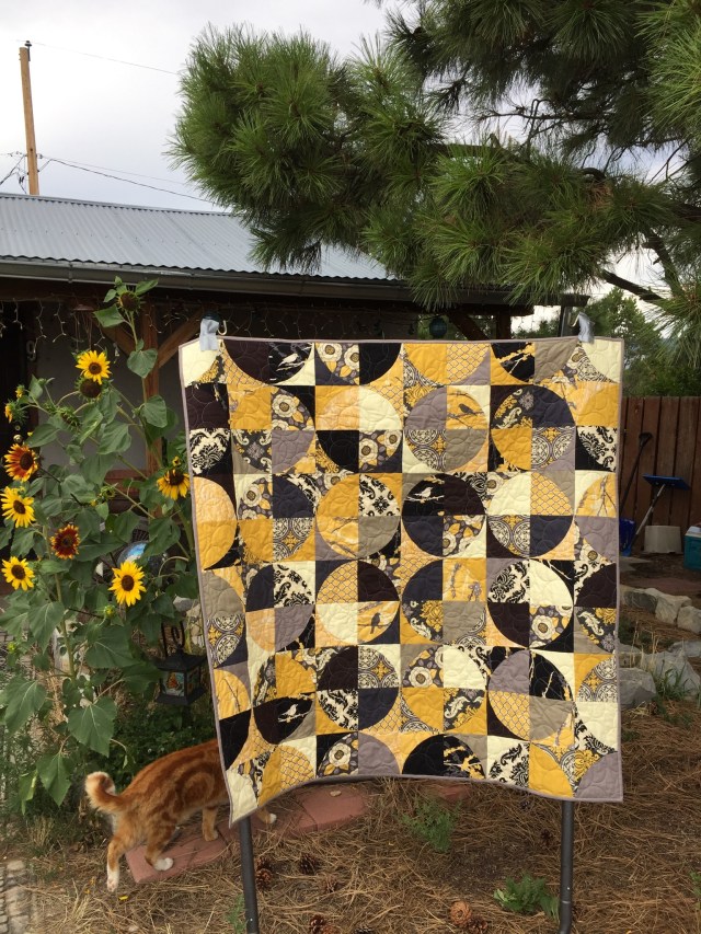 Below is my Aviary quilt all finished! I wanted to include some late summer sunflowers, and the photo bomb by my cat, Rusty, is just a bonus! I hope you can enlarge the photo and see the cool Bubbles quilting pattern.