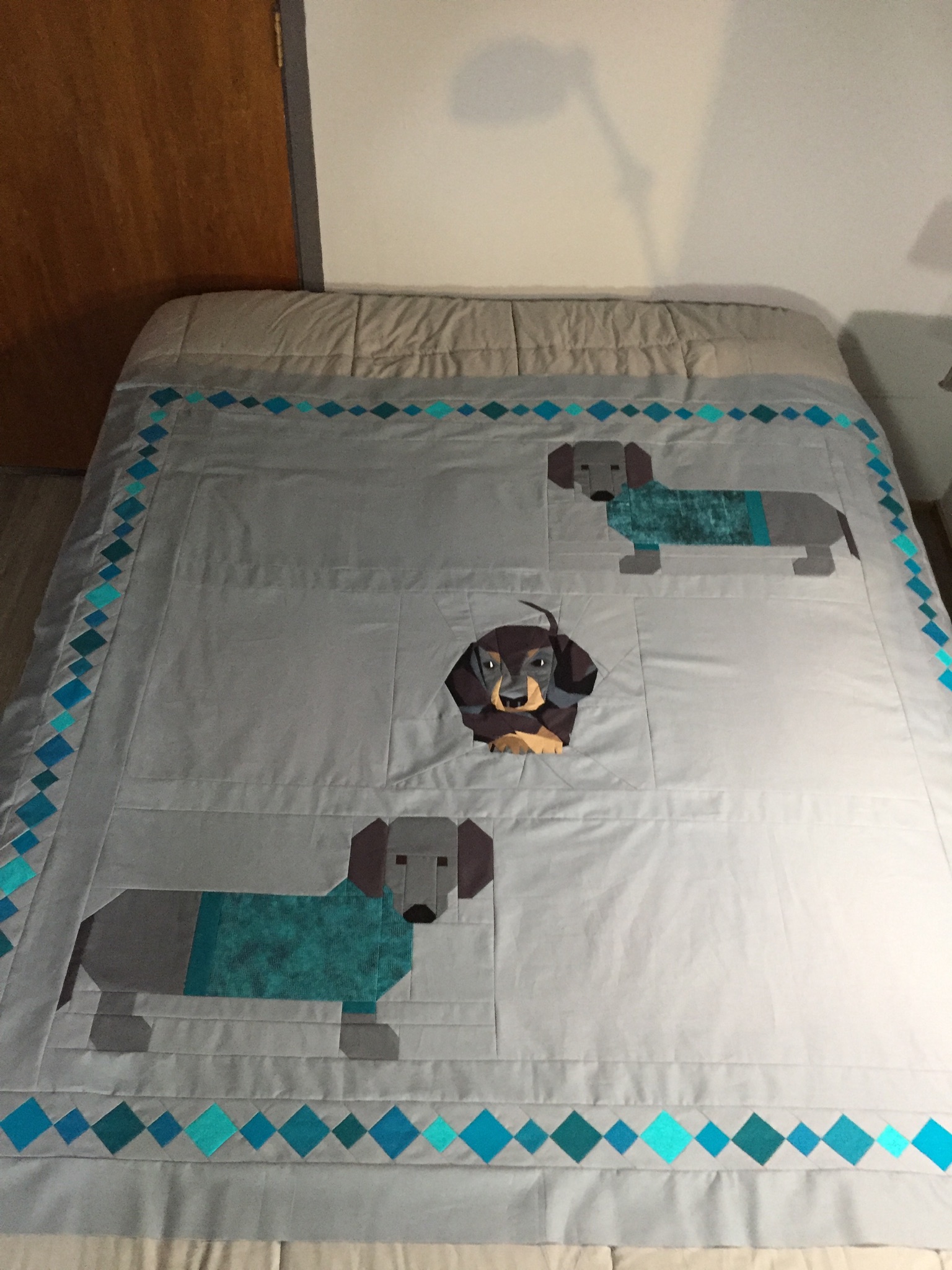 The doxie quilt is so fun! The turquoises in it just glow, Mary. Aviary is beautiful, and the quilting is definitely perfect for the design! Nice finish!