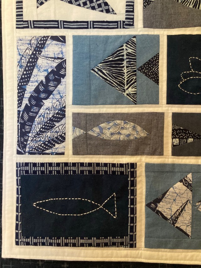I finished quilting my Indigo quilt top that used indigo fabrics from my mom’s stash in the 1990s. I just quilted straight lines with white thread in the sashing and one straight line with navy blue thread on the blue border that is barely visible in the photo below.
