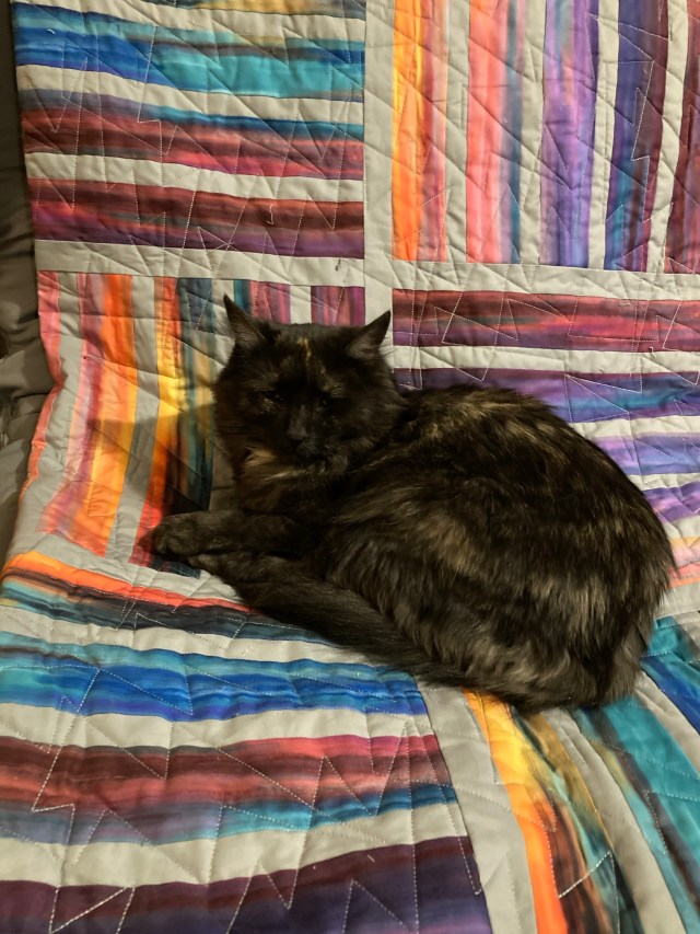 I asked Jessica at @sugarmillquilts to do the longarm quilting for me for my Blakely-esque  Sunset quilt because she offers a quick turn-around and does lovely quilting. We put this 55” square quilt on the lounger in living room, and the cats have given it a Paws Up. Below is a photo of Weebles enjoying the new quilt.