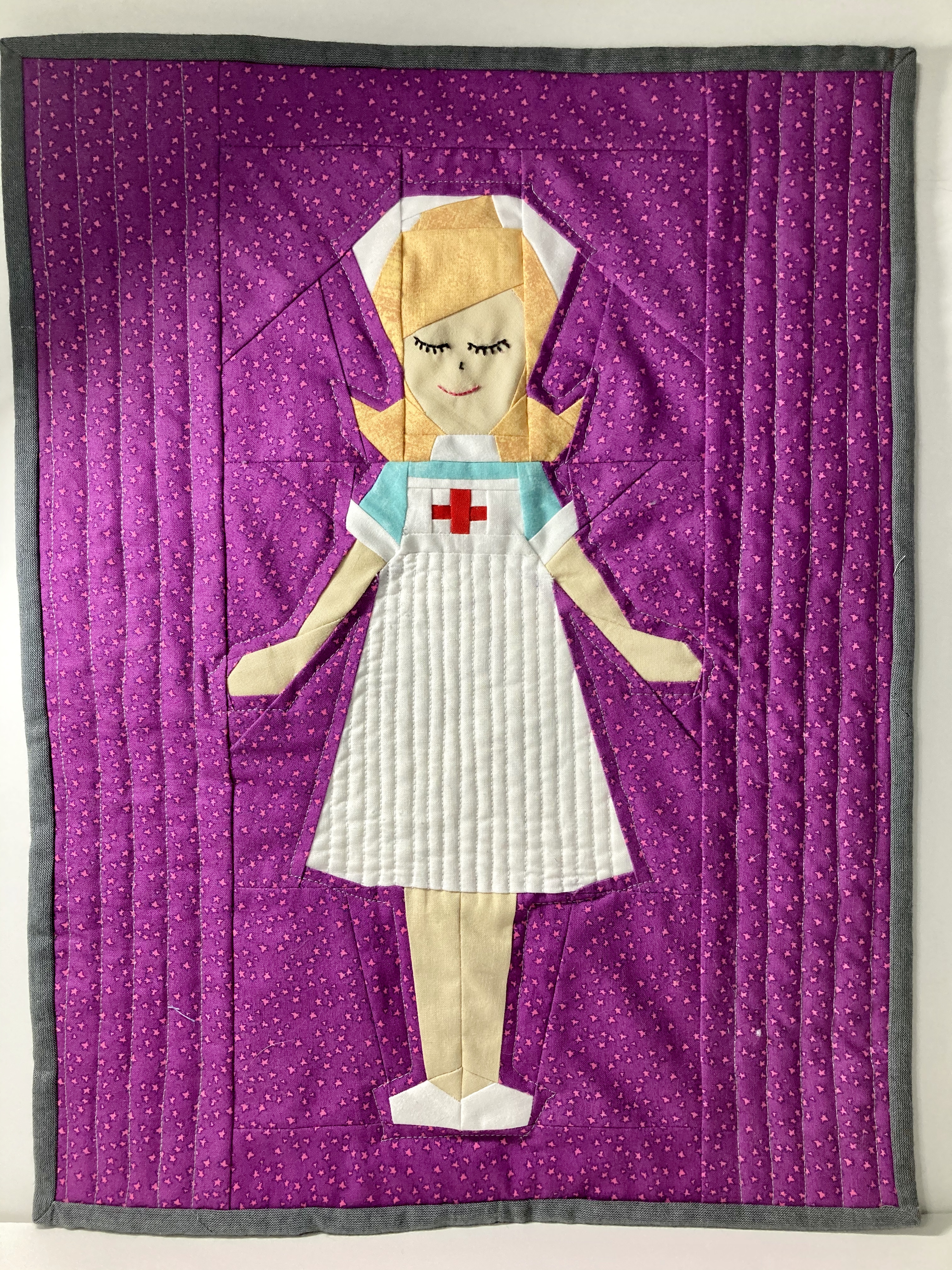 My great-niece, Rachel, who lives in Michigan is getting her RN on May 14th. I decided to make her a 14” x 18.5” mini to celebrate this awesome accomplishment. I found a paper-pieced vintage nurse pattern on Etsy. Most of this pattern went together easily though there were two Y-seams required that weren’t mentioned in the pattern description and the instructions for the red cross on the bodice were confusing and I ended up needing to fudge that part to make it work. I also did some simple embroidery on Nurse Rachel’s face. The quilting is also simple. I used a white Chaco liner to mark the straight quilting lines on the purple fabric but decided to try using a Hera marker for the quilting lines on the dress which worked really well. Below is a pic of the front of the quilt and the second photo is the back of the quilt made with a cute Nurse fabric I found on Etsy.