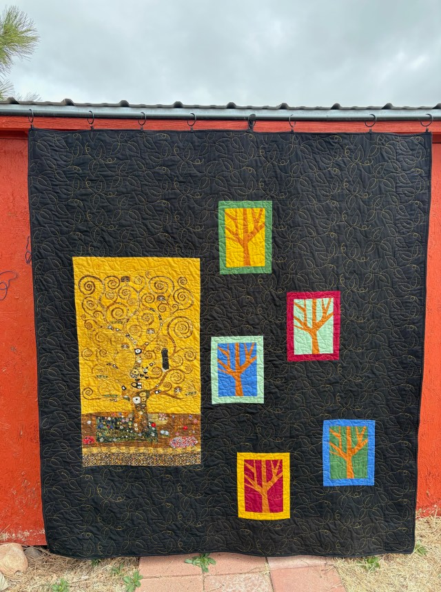 I knew I wanted to piece the back but wasn’t feeling particularly inspired until I searched Etsy again for Tree of Life panels and found a really cool Gustav Klimt Symbolist Painting panel at the Fieldsfabric Etsy shop. Later that morning I was on Pinterest, and Carolyn Friedlander’s Olive pattern showed up in my feed, and we decided that using five Olive blocks along with the panel and A LOT of Kona black fabric would work nicely for the quilt back. I’ll tell you a secret–the quilt back is actually more to my taste than the quilt front! I decided not to label this quilt so it could be easily used as a two-sided quilt.